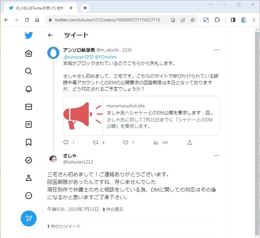 シャインマスカット氏(仮名)へのシャトーとのDM公開要求期限である7/23が過ぎ、過去のシャトーへの呼びかけも含めると、両者ともから何の返答も頂けないままに終わりました。