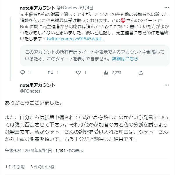 それは、シャインマスカット氏は本件に対して回答するためのアカウントに別アカウントを作成し、そちらで質問を受け、回答を行ったり、誰かに抗議したりていたからです。(過去形なのは、6/28に以下のように「自身の責任は果たした」として、回答用アカウントの運用を終了すると宣言されたからです)
