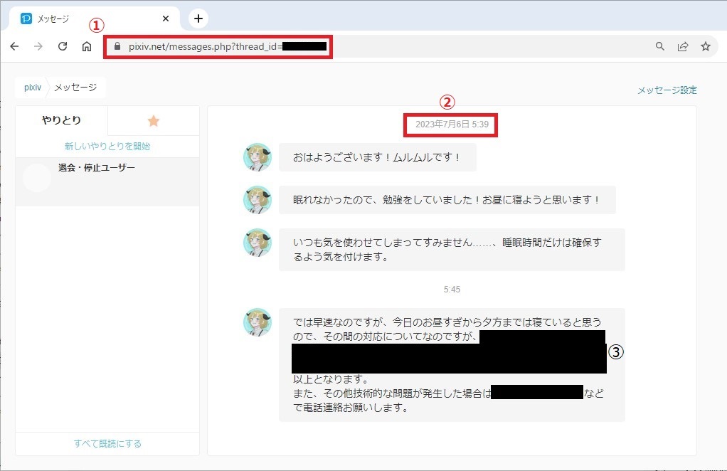 ①ブラウザのURL欄からpixivでのDMであると判別できること
