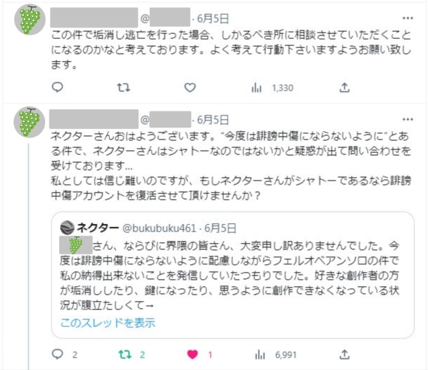 また、シャトーは「シャインマスカット氏から漏洩したDMをツイートで公開していた」ため、それを目にすれば自分がpixivで相談した人物であると分かるはずです。